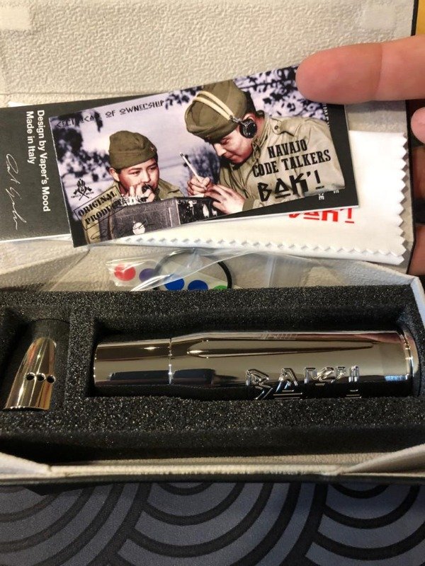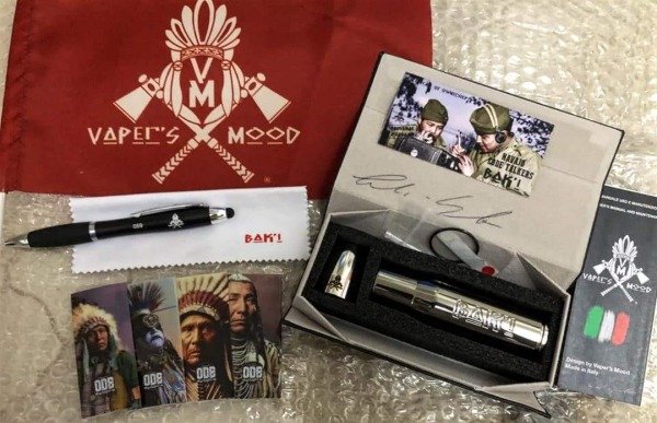 Diseño: Cuenta con una forma unica de bala u ojiva, con el nombre "BAK'I" grabado en el lateral y el logotipo de Vaper's Mood en la parte inferior.