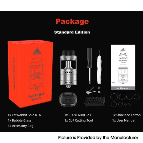 El Fat Rabbit Solo RTA viene equipado con un tubo de vidrio adicional, resistencias de alta calidad, algodón, herramienta de corte de bobinas y una bolsa de accesorios, para que tengas todo lo necesario desde el primer momento.